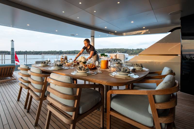 During a typical charter, Mykhailo will take the tender and go to local markets to source ingredients three or four mornings a week. Like any good chef, he hunts for what’s locally grown and in season. That might be succulent tomatoes or a bag of juicy peaches, offering such a blast of sun-ripened flavour that the dish or dessert that evening will need little else in the way of embellishment.