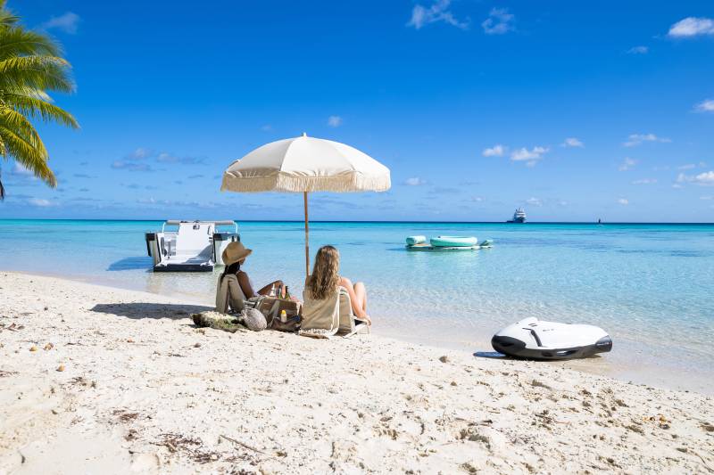 Breakfast followed — fresh sourdough, fruit, pastries, and Fleur’s favourite: the truffle omelette. “Then maybe a quick e-foil lesson with the crew before taking the helicopter to a remote, uninhabited atoll for a picnic. It was truly the most idyllic island I’ve ever seen — totally untouched, the colours unreal.”