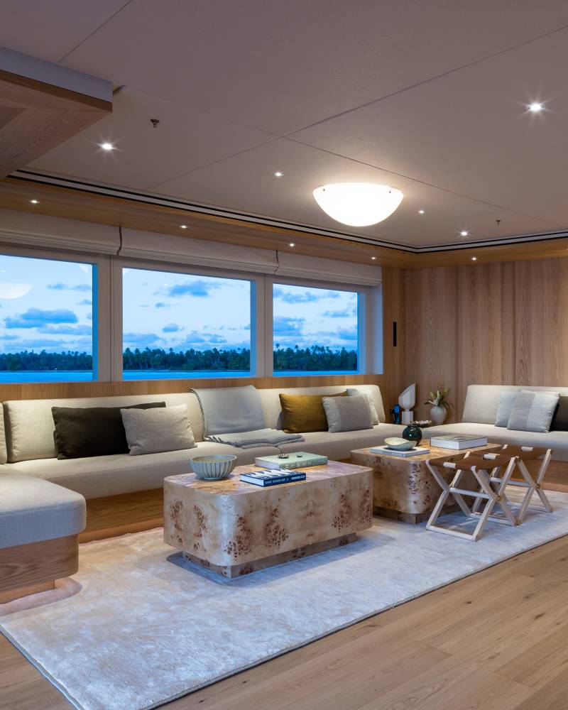 Inside, designer Misha Merzliakov has created a light, organic aesthetic: soft neutral tones, natural textures, and an easy connection to the sea. Seven flexible cabins, a cinema room, a gym, and a wellness space with sauna and cold-plunge pool give guests the freedom to unwind or gear up for a day of exploration. Outside, the decks stretch out for dining, lounging, and moonlit cinema nights.
