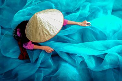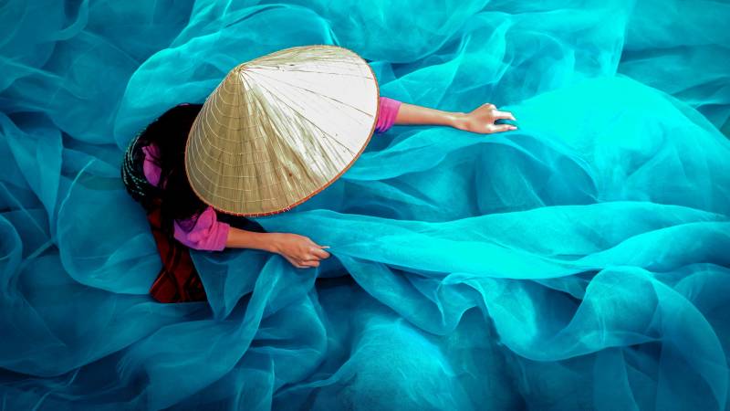 In the coastal city of Bac Liêu, the sight of workers, clad in traditional leaf hats, knitting their way through seas of cerulean nylon nets is a common one. For each net, three to five craftsmen use tiny needles to weave nets that are tight enough to catch the array of shrimp, fish and crabs to feed the local community. As they knit, the waves of netting ripple out behind them in a sea of blues, resembling the waves into which they will soon be submerged.