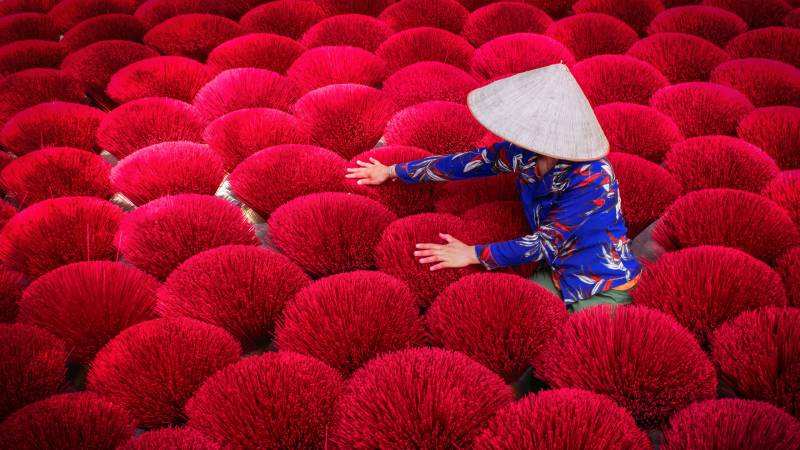 The village of Quang Phu Cau on the outskirts of Hanoi turns a vibrant shade of magenta before every lunar new year, as hundreds of workers chop, dye and dry bamboo bark to make the joss sticks the village is famous for. After being laid out to dry, the craftsmen use their feet to tie the incense sticks into large bundles that are laid out in courtyards, resembling fields of flowers.