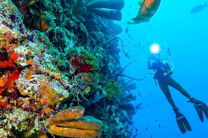 Belize’s smallest and most southerly atoll, Glover’s reef is unmatched by any dive location in Belize. Far from the busy scuba diving hubs of Ambergris Caye and Belize city, its untouched and virtually unchartered reefs and 50 miles of sheer drop-offs make the journey worth the effort. Head to the Aquarium for sightings of huge schools or wrasse, horse-eye jack fish and yellowtail snappers, plus the occasional dolphins and turtles, or go to Manta Wall for nurse sharks and huge groupers, almost as big as yourself.