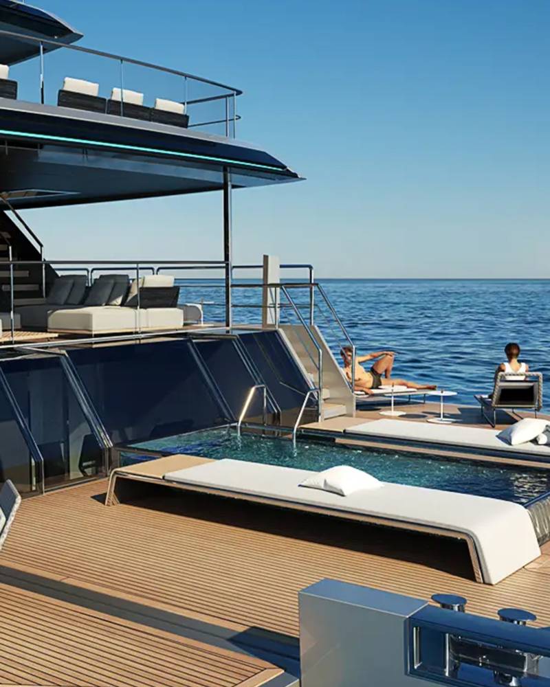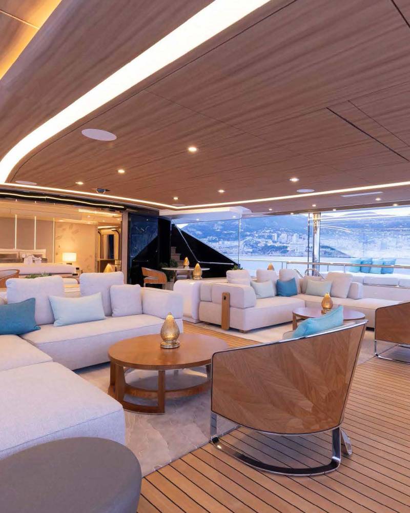 When it comes to style, it’s hard to top the Italians. And Riva’s largest superyacht to date, Sairu, is certainly no exception. Over 370 square metres of outdoor space includes a beach area with a 5m long swimming pool flanked by sunloungers; this is La Dolce Vita at its very best.