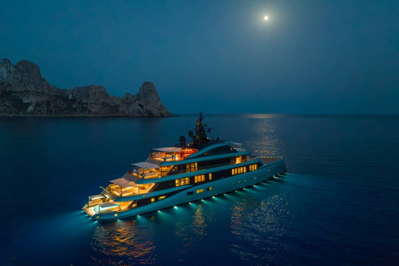 Striking from every angle. With a vast 200-square-metre sun deck and unmistakable lines, Halo is made for those who like their yachts with presence. Wellness and celebration sit side by side: think sunrise yoga, sunset champagne and all-day energy in between. Her crew includes a personal trainer and yoga instructor — perfect for a vibrant start to the new year.