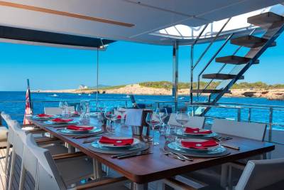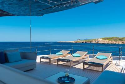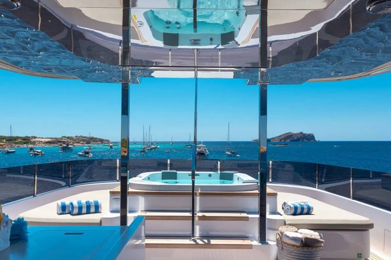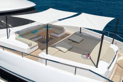 From bow sunpads to aft lounges and a sundeck with Jacuzzi, Acqua was built for outdoor living. The shaded upper deck dining space seats ten, while wide walkarounds and seamless glazing enhance the sense of space at every turn.