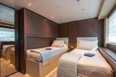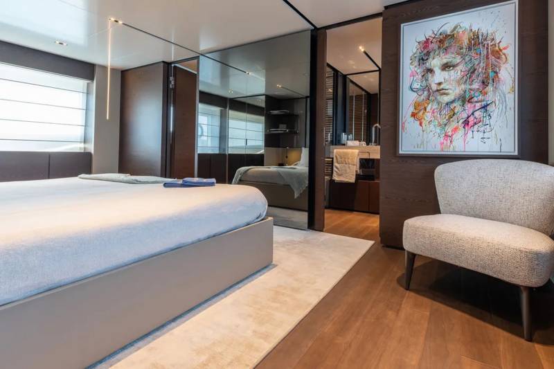 Acqua sleeps 11 guests across five serene staterooms. The Owner’s suite is on the main deck, full-beam and flooded with light. Below, four additional cabins – including a twin with Pullman – cater to friends, family, or staff. Each room offers sleek ensuite bathrooms and elegant, contemporary finishes.