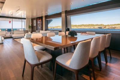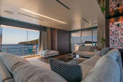 With interior styling by Zuccon International Project, Acqua’s spaces are light, harmonious and designed for flow. The upper deck lounge features sliding glass doors that open the room entirely to the breeze. Wherever you are on board, the connection to the sea is always there.