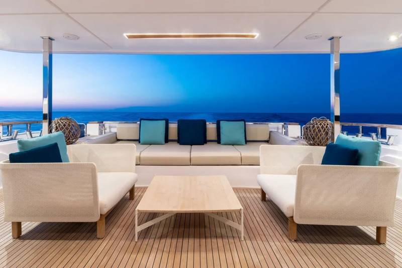 Powered by twin MAN V12 engines, Acqua cruises at 12 knots with average fuel consumption between 300–350 litres per hour. Quantum stabilisers work both underway and at anchor, making the ride effortless. A tri-deck layout and displacement hull add to the quiet confidence of every journey.