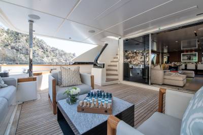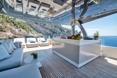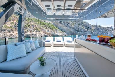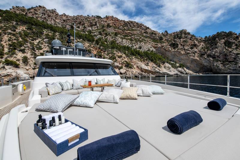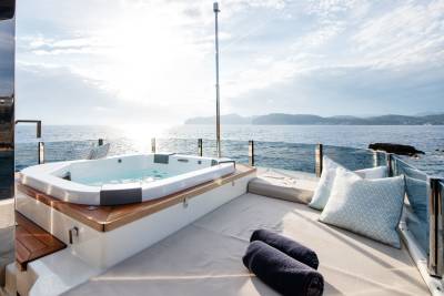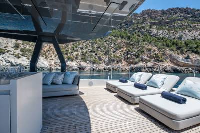 Alberry’s outdoor spaces facilitate every kind of relaxation. On the sun deck the spacious jacuzzi benefits from uninterrupted views while guests can choose to soak up the sun from the ample sun pads forward or from the comfort of the loungers aft. Plus, with a bar and lounge seating, the sun deck is a space to be enjoyed at any time of day. Alternatively, the sun pads on the foredeck are expansive and offer panoramic views of the chosen destination.