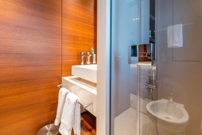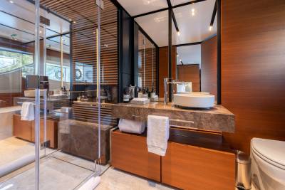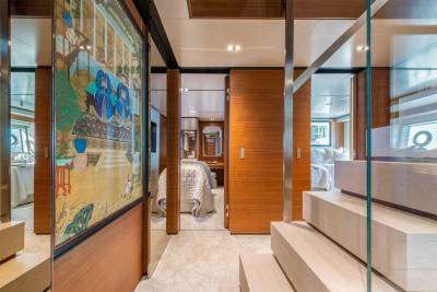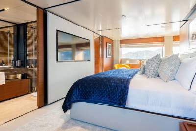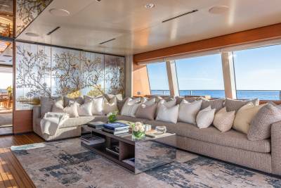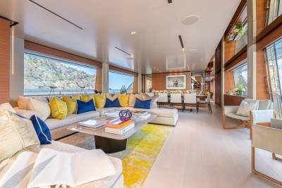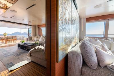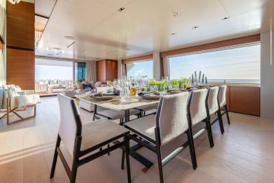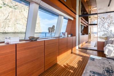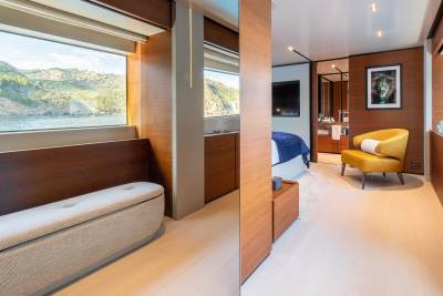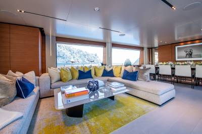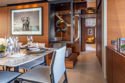 Inside, the contemporary styling is infused with Asian influences with beautiful details that accent the clean, fresh look of the soft furnishings. The main salon has a spacious lounge area and large dining table; the whole space is bathed in natural light thanks to large windows, including a floor-to-ceiling window on one side, keeping guests connected to their destination at all times.