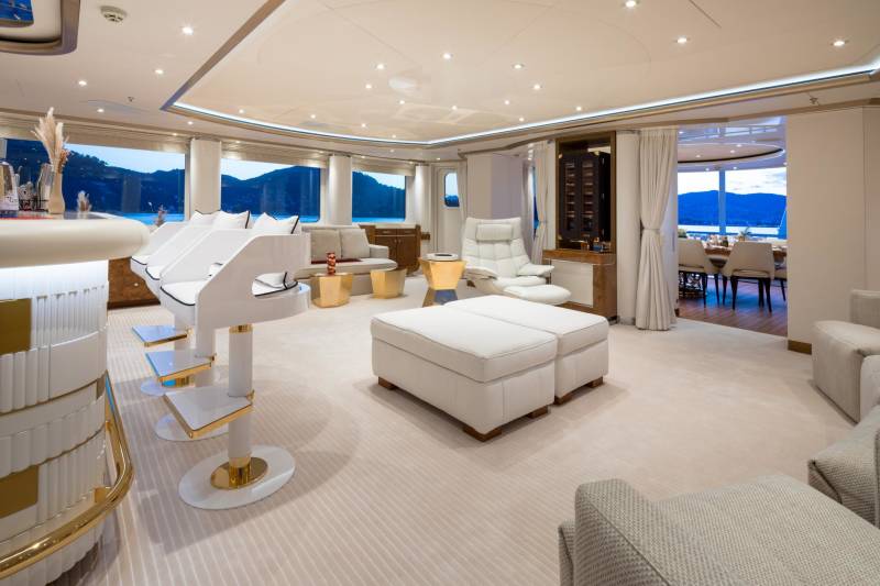 The jewel onboard Alfa G’s world-famous Winch Designs exterior takes pride and place on her expansive sundeck. Al fresco dining for up to 18 under the canopied shade or revel in sun downers at the pool bar to the aft. Designed to host the best in the game, the outdoor cinema, disco and BBQ make for an impeccable experience that runs from dusk till dawn.