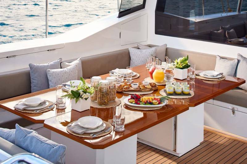 Multiple dining and lounge areas allow guests to gather together or break into smaller groups. From the forward lounging area to the cockpit dining space for 12, every zone is designed for easy hosting. The outdoor cinema adds a playful edge, turning quiet anchorages into memorable evenings under the stars.