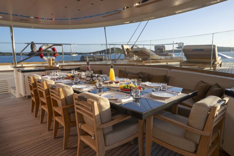 Service on Asahi is quietly attentive and highly practiced, shaped by an experienced crew who understand the rhythm of a large performance ketch. Days unfold smoothly, from relaxed breakfasts on deck to well‑run watersports sessions supported by an RYA‑approved set‑up, with refined dining and easy logistics handled in the background. MCA compliant and detail‑focused, the team keep safety, comfort and discretion front and centre so guests can simply enjoy the sail, the scenery and the moment.
