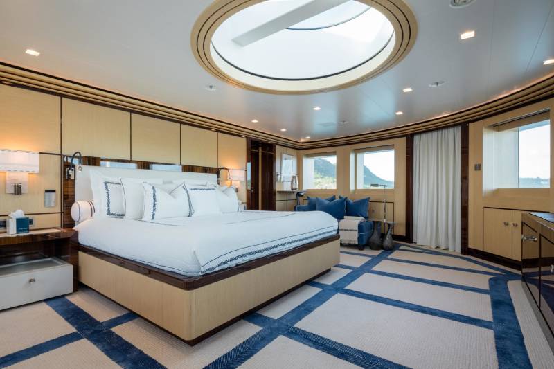 Axioma accommodates 12 guests across six exceptionally spacious cabins, all located on the main deck and above. The principal suite occupies a private owner deck forward, offering the feel of a standalone apartment with its own terrace. A full‑beam VIP and four further guest cabins complete an arrangement that prioritises space, privacy and natural light.