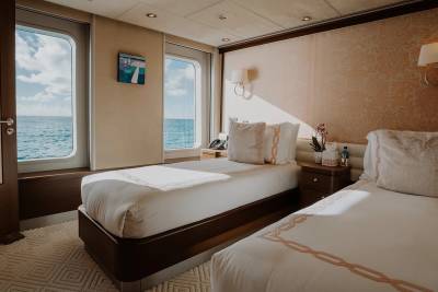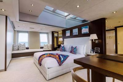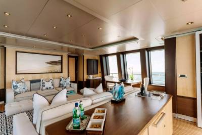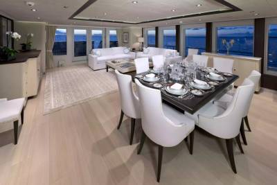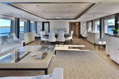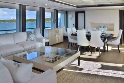 Relax or dine with friends and family in the main salon of the yacht Bella, surrounded by large windows that offer breathtaking views and fill the space with natural light. This spacious and elegantly furnished salon is perfect for socializing, dining, or simply unwinding in luxury.