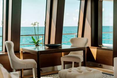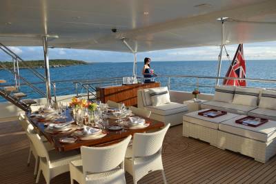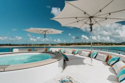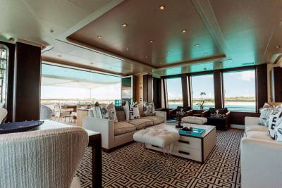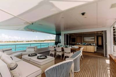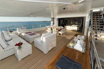 Bella's bridge deck terrace beautifully merges outdoor charm with indoor luxury, offering direct access to the skylounge. This feature allows guests to easily transition from sunbathing and enjoying panoramic ocean views outside, to relaxing in the well-appointed skylounge.
