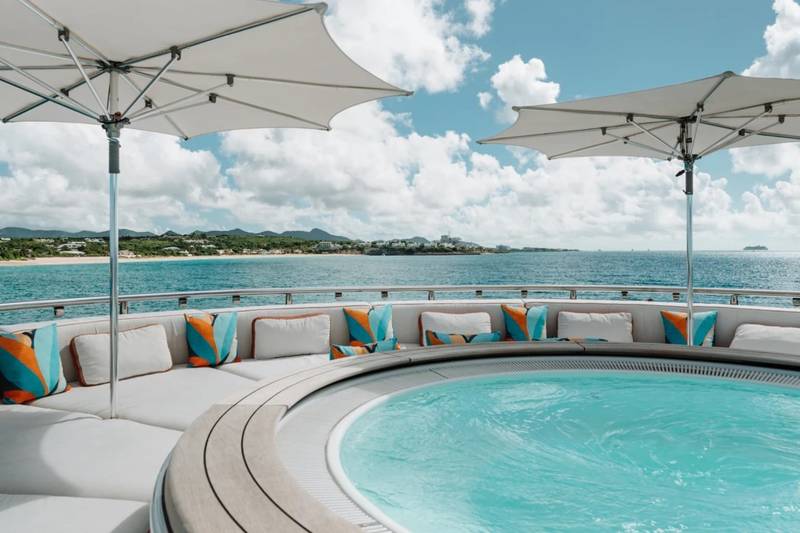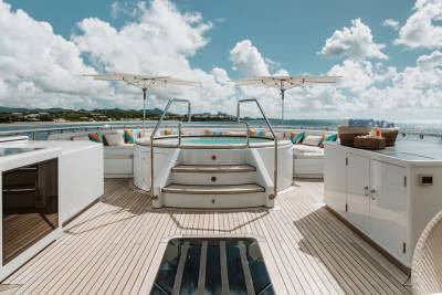 On Bella's sundeck, indulge in relaxation in the jacuzzi, savor drinks in the spacious seating area, or engage in an al fresco workout. This area is expertly designed for ultimate comfort and enjoyment, offering a variety of activities under the open sky.