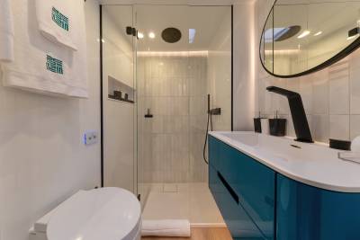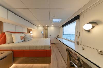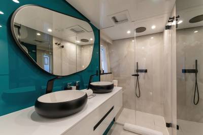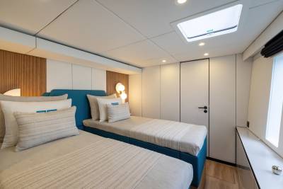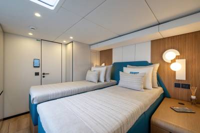 Belldia accommodates up to eight guests in four stylish and chic cabins. Three of the guest cabins are doubles while the fourth is convertible and can be configured as a double or twin cabin to suit the charter group. All cabins are ensuite and offer extreme comfort, the perfect sanctuary on board after a day enjoying fun in the sun.