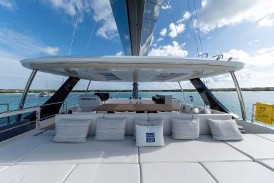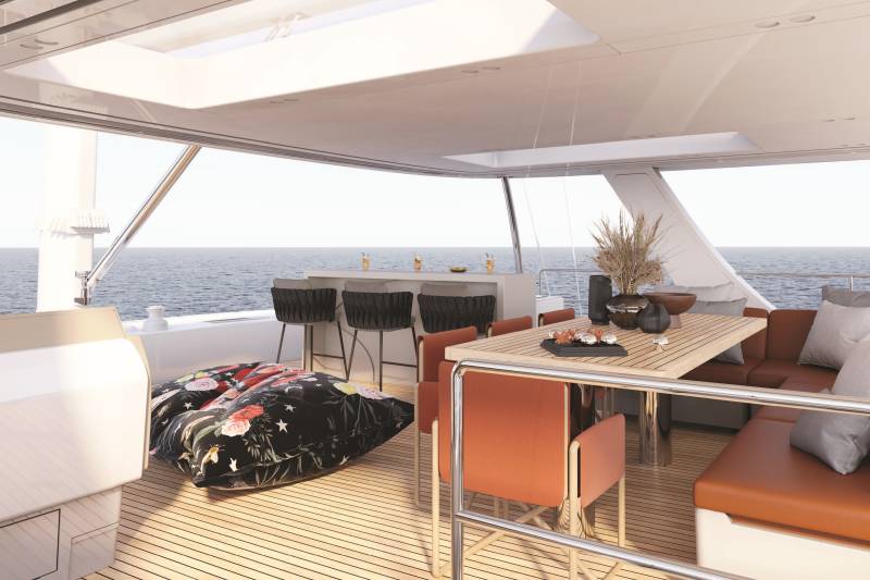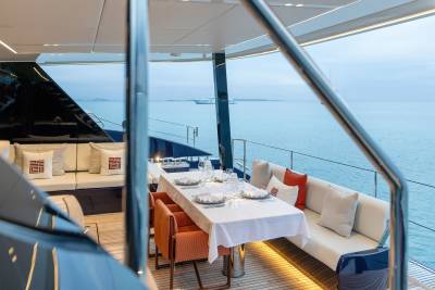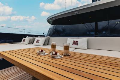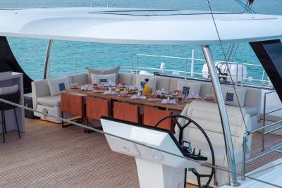 The sun deck is a prime location for soaking up everything about your surroundings. The unobstructed views change every day and provide the perfect backdrop for a yacht charter of a lifetime. With a bar, al fresco dining area and an inviting relaxation space, the sun deck is the place to be on board.