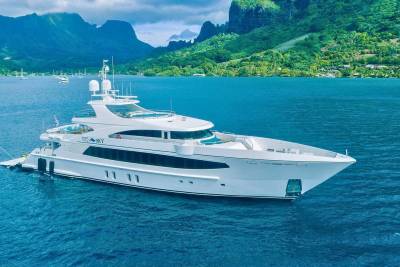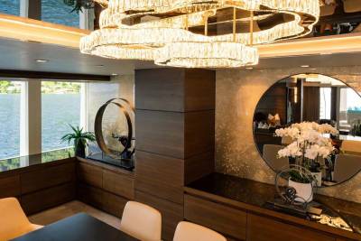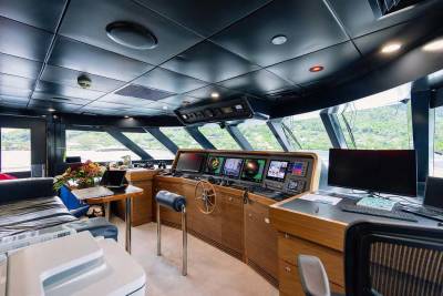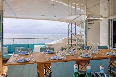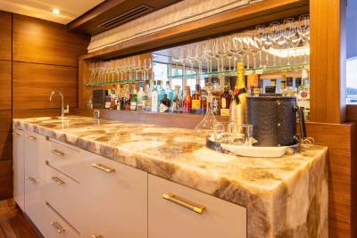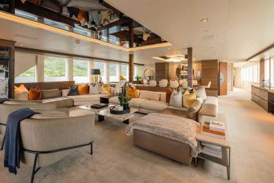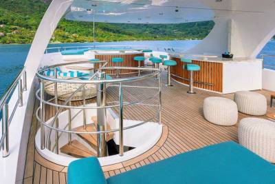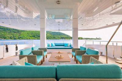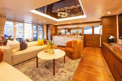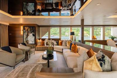 48m Big Sky is all about outdoor living. Her exterior spaces are second to none and offer an unparalleled standard of al fresco enjoyment. A fantastic beach club with access to an array of water toys. A stunning sun deck with Jacuzzi, sun pads and bar. Al fresco dining on the aft deck and a sociable seating arrangement for lounging in the sun. Big Sky’s neutral interiors are modern, bright and incredibly spacious. Accommodation for 10 guests is in the form of a master suite, three doubles and one twin cabin. With an almost 1:1 ratio, the crew of nine will be on standby to take care of your every whim.