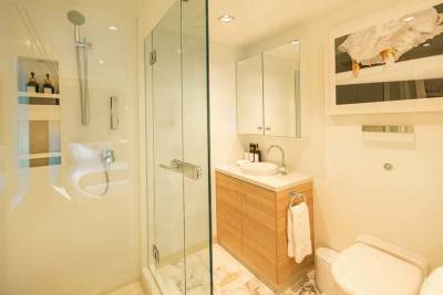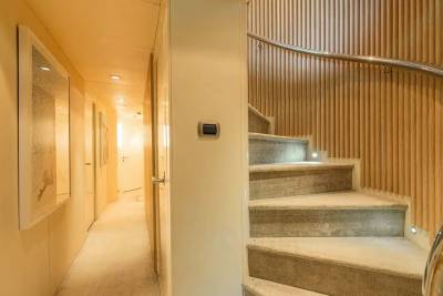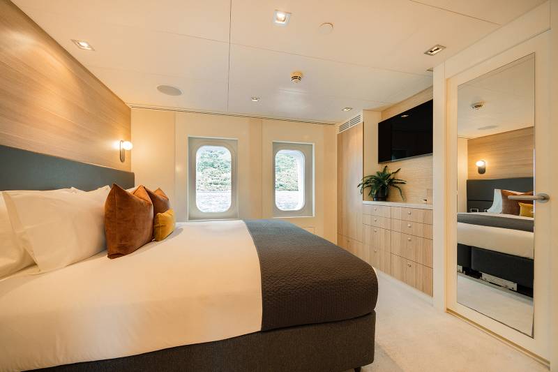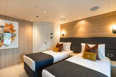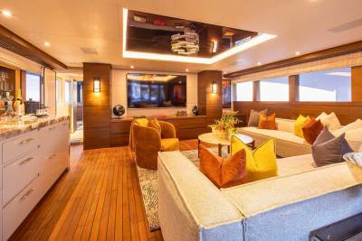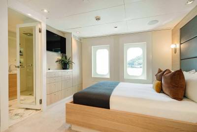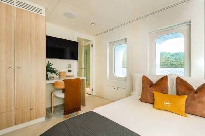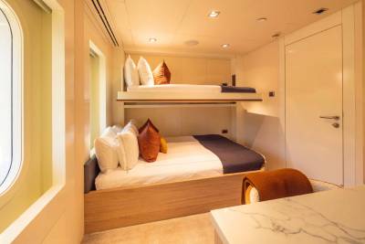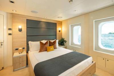 Big Sky accommodates up to 11 guests across five ensuite cabins, arranged to suit families and groups travelling together. The main deck principal suite benefits from full‑beam proportions and excellent natural light, while four further cabins below deck offer a mix of queen, convertible and Pullman configurations for flexibility.