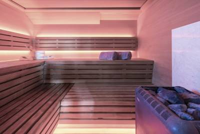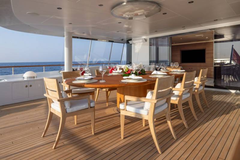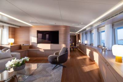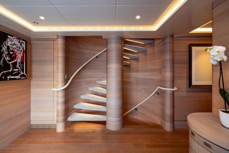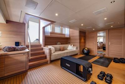 Her 21.5sqm beach club isn’t just a waterline hangout – it’s a full wellness zone with Technogym gear, sauna, and sea views.