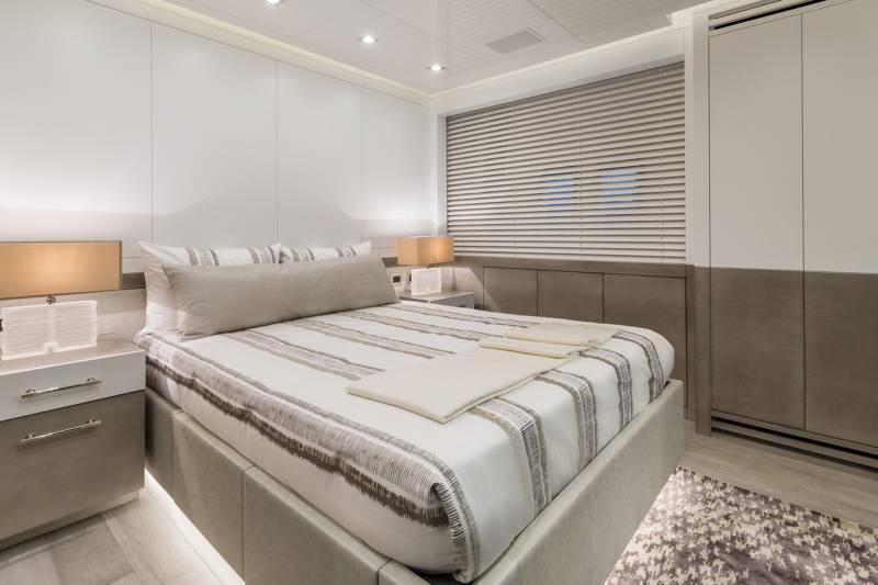 Da Vinci’s accommodation feels bright, sculpted and quietly luxurious — a modern expression of Mangusta’s long, flowing interior style. The full‑beam principal suite on the lower deck offers rare width for a fast yacht of this size, complete with a lounge area, dressing spaces and an ensuite with bath and shower. A forward VIP spans the yacht’s beam, complemented by two queen staterooms and a flexible twin cabin with bunks, ideal for younger guests. A compact single‑cabin/office adds extra versatility. With soft textures, light woods and a clean palette, the guest areas feel relaxed, refined and easy to settle into after a fast day at sea.