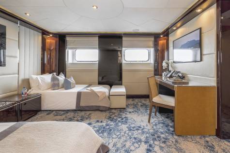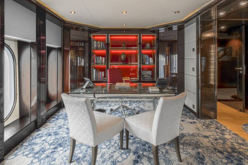 At 110m², Dream’s Owner’s apartment is one of the largest in her class. It includes a grand lobby, his-and-hers bathrooms (with a jacuzzi and steam shower), a private office, and a wellness room — all of which can be adapted to create up to two additional staterooms. This flexibility allows for everything from expansive privacy to increased guest capacity for large family or charter use.