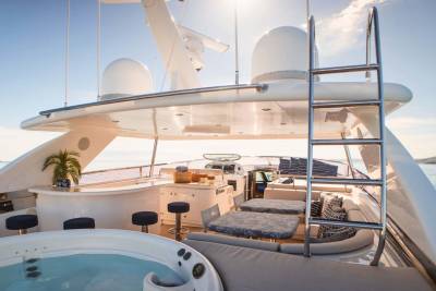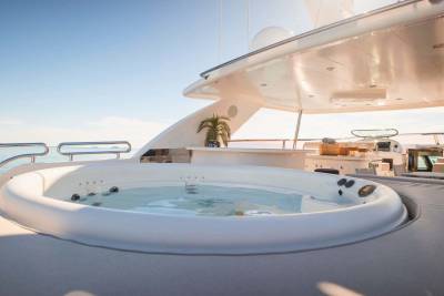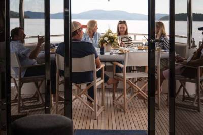By midday, everyone drifts upstairs. The flybridge becomes the social hub, with the jacuzzi bubbling, sunpads claimed and a shaded dining table ready for long, unrushed lunches. Let the mixologist craft your favourite drink from the bar. The breeze keeps things cool as you cruise to the next anchorage. It is the spot for books, playlists and that “we are really away from it all” feeling, with 360 degree views of sea and sky.