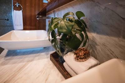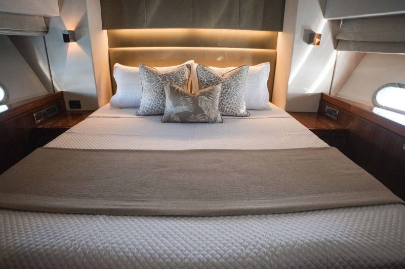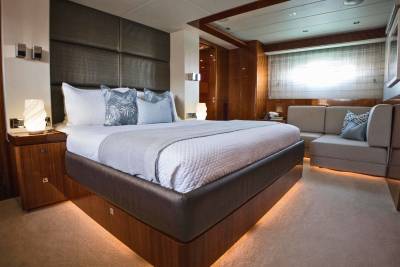 Encore sleeps eight guests in four well considered cabins, each with its own bathroom. The full beam master suite sits amidships with a queen bed and generous storage. Forward, a VIP cabin also offers a queen bed and plenty of light. Two convertible twin cabins complete the layout, switching easily between twin and double setups for family or friends.