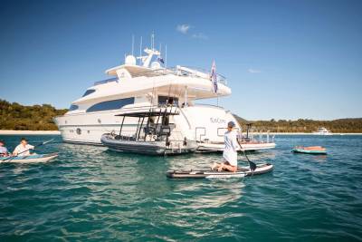 Encore’s wide swim platform is your launch pad for everything wet. Days fall into a happy rhythm of snorkelling over reef, taking the jet ski for a spin, or learning a new trick on the flight board. The crew are used to mixed groups, helping confident riders push a little further while keeping things safe and fun for younger guests. When you want to dial it back, kayaks and stand up paddle boards make it easy to explore bays at your own pace.