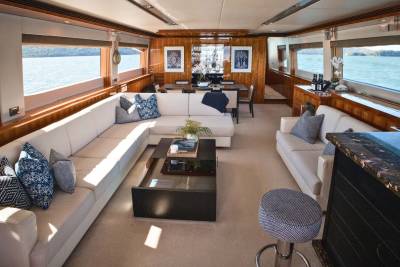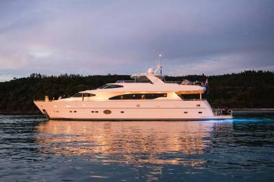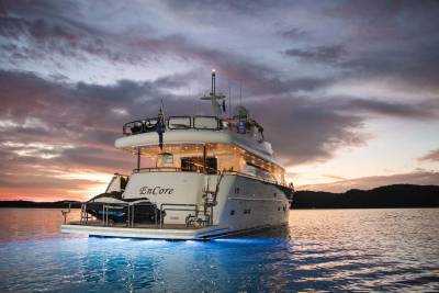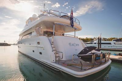 Step aboard Encore and check into your favourite floating beach house. Built by Horizon and refit in 2021, this 29.5 metre motor yacht for charter is made for Australian coastal cruising, from sand-fringed bays to remote azure anchorages. A bright, easy saloon, flybridge jacuzzi, big aft deck and generous swim platform set the tone. Four cabins sleep eight guests in comfort, with a full beam master, forward VIP and two convertible twins. With a seasoned local captain and a charter friendly layout, Encore is all about relaxed days, long lunches and unhurried time on the water.
