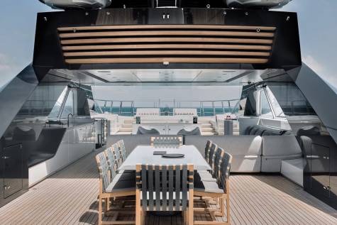 To maximise everyone's enjoyment of the water, luxury yacht Entourage features a spacious beach club connected to a swim platform, offering ample lounging areas and stunning sea views.