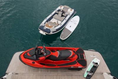 Toys include a 35ft Boston Whaler tender with Seakeeper Gyro stabilisation, kayaks, paddleboards, sea scooters, bikes & beach equipment.