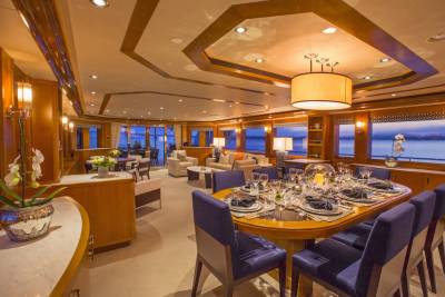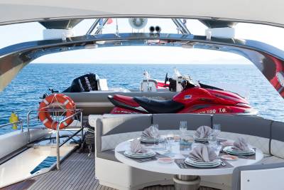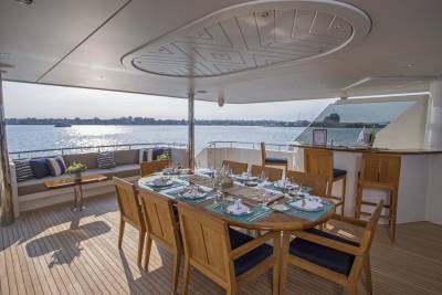 Far Niente offers shaded alfresco dining for 10 guests, comfortable sun loungers, a large-screen TV, and a jacuzzi on the sundeck for your relaxation and enjoyment.