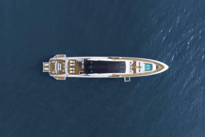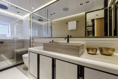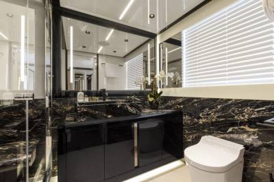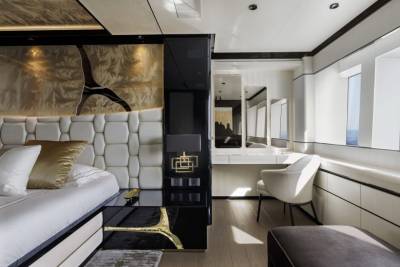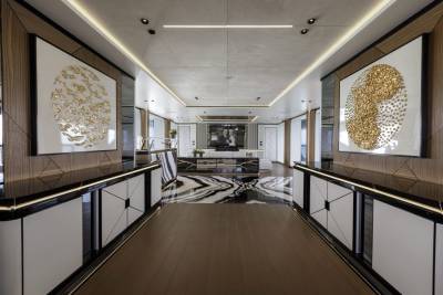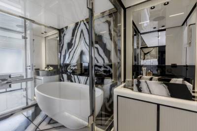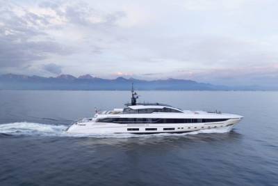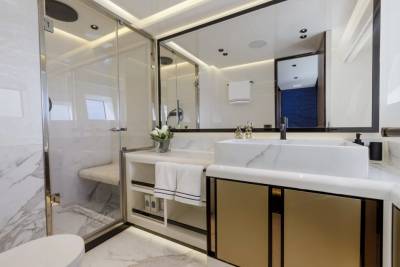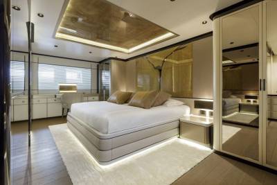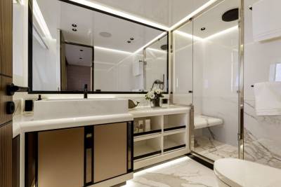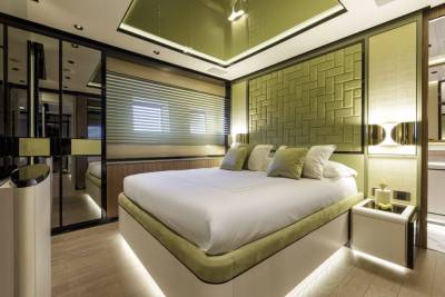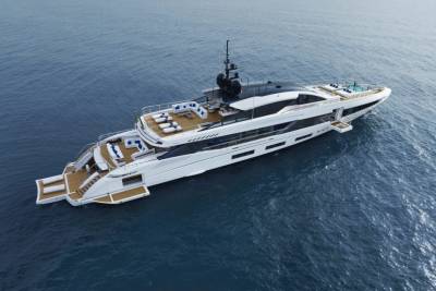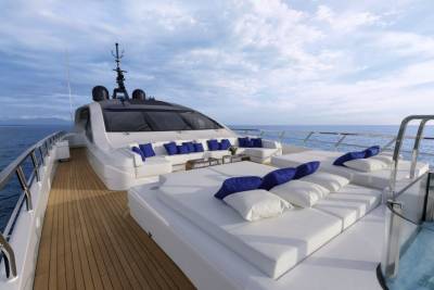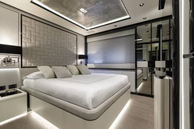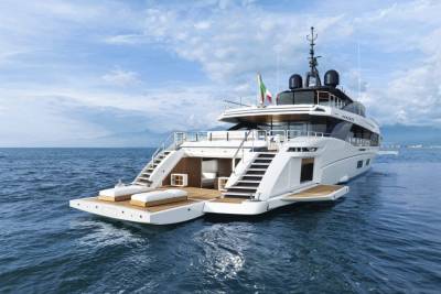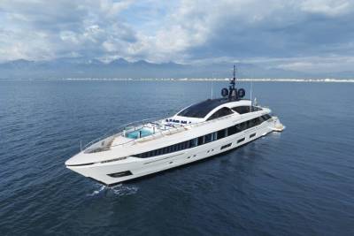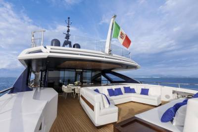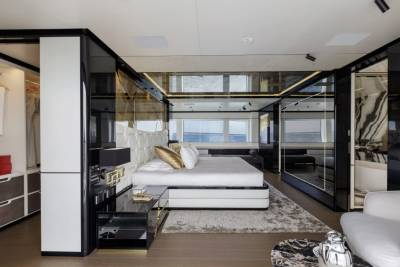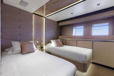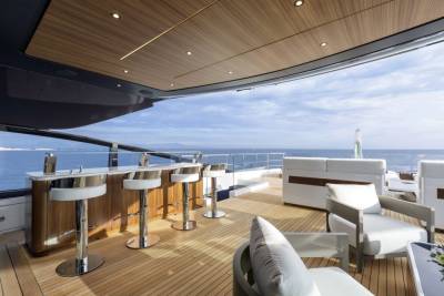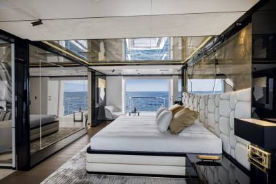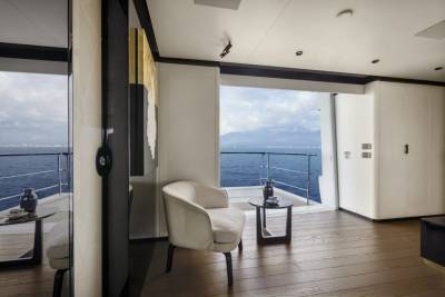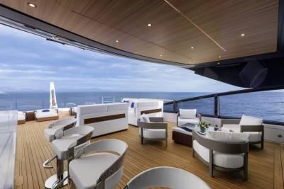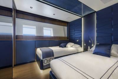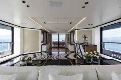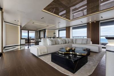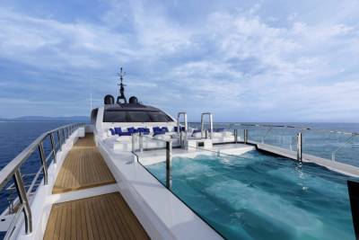 Outdoor living is central to her design, with expansive decks, a generous beach club, and a striking foredeck pool that creates a private space with uninterrupted views. Inside, refined Italian styling, light-filled interiors, and spacious guest accommodation make her equally suited to long passages or relaxed time at anchor.