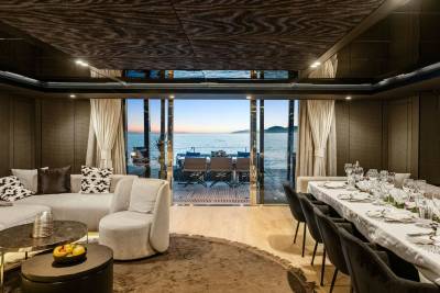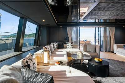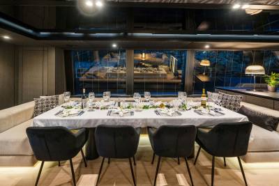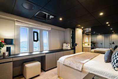 Step inside to a soft, sophisticated world. Graya’s interiors are finished in a neutral palette with light woods, textured fabrics, and panoramic windows that draw the sea inside. Every detail is considered to feel airy, modern and utterly relaxing — from the open-plan salon to the naturally lit guest cabins. Understated, elegant, and refreshingly calm.