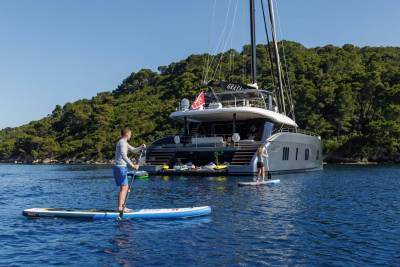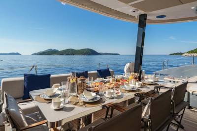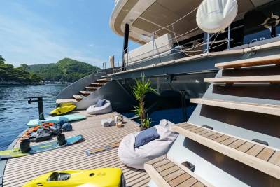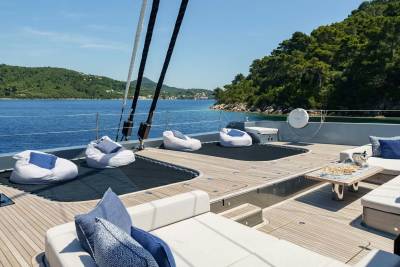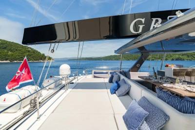 Graya isn’t just stylish — she’s sociable. With a welcoming crew and a versatile layout, she’s designed with families in mind. The triple guest cabin is perfect for kids or friends, while the top-deck barbecue and water toy line-up invite hours of fun in the sun. Whether it’s an island-hopping adventure or a laid-back escape, she makes it easy to enjoy every day on the water.