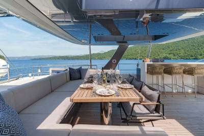 One of the greatest luxuries aboard Graya is space. From her vast flybridge to wide walkaround decks and multiple al fresco lounges, guests can gather in style or drift off for quiet moments. Whether it’s morning yoga, an open-air breakfast, or a sunset cocktail by the bar, Graya lets you move with ease — and unwind at your own pace.