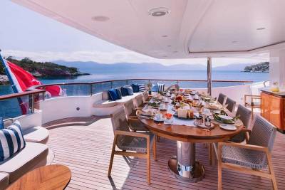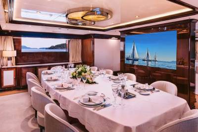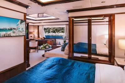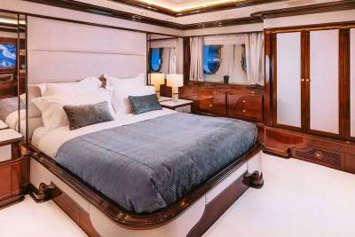 Idyllic offers 12 guests six serene suites designed for comfort. The split-level master on the main deck includes panoramic views, an office, and bow access. A VIP suite features a king bed, lounge, and dressing room, plus four doubles with en suites ensure space for all to unwind.