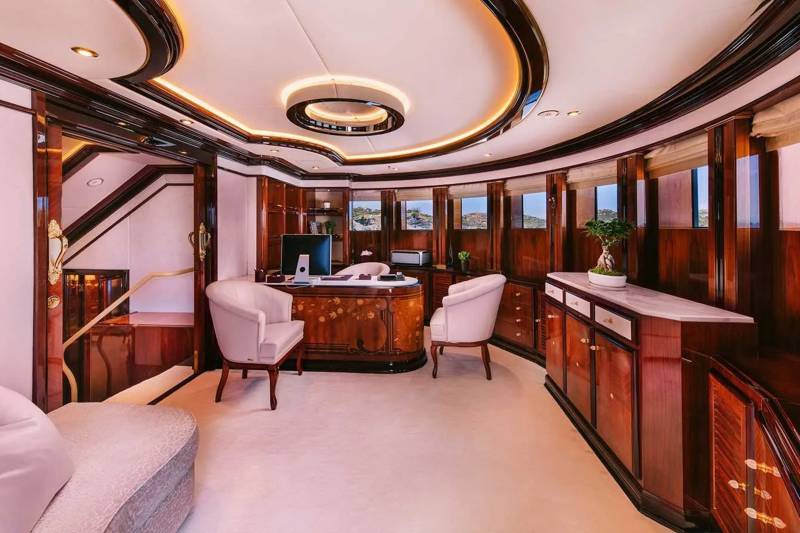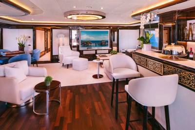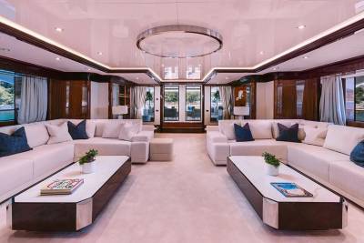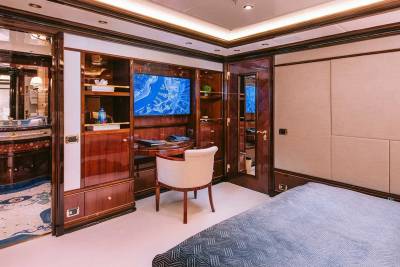 Set across two levels with wraparound views, the master includes a lounge, office, and private outdoor access – rare scale and privacy for a yacht in this class.