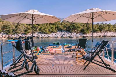 Two professional chefs craft every meal, from beach picnics to sunset tasting menus. Enjoy effortless wellness with a private gym, sauna, and massage space—never skip a workout while at sea.
