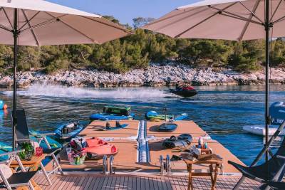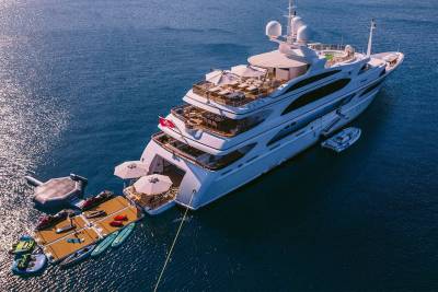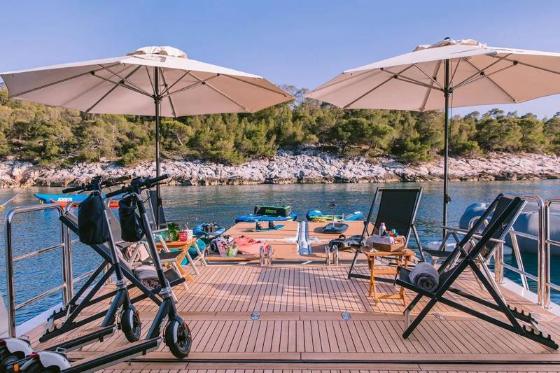 Idyllic’s three tenders, including a Castoldi, Williams Dieseljet, and SOLAS rescue boat, offer seamless transfers and adventure. Jet skis, inflatables, wakeboards, and water skis cater to all ages, while platforms, sea pools, and snorkelling gear complete the perfect day on the water.