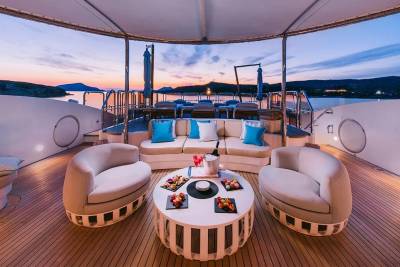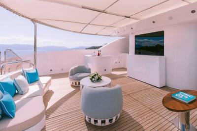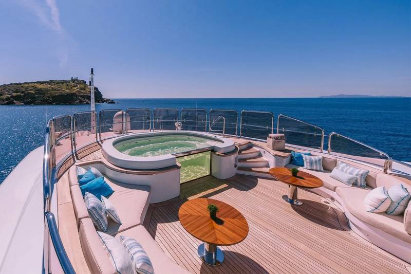 The sundeck is built to entertain, with a Jacuzzi, open-air bar, and oversized loungers that rival any luxury resort.