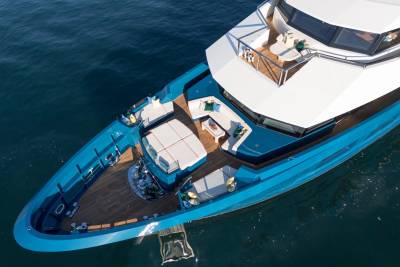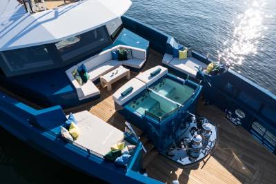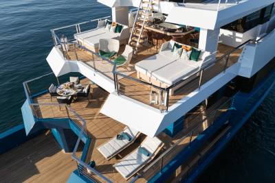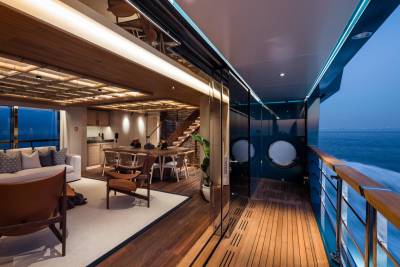 The beach-club-style aft deck can become anything: a yoga studio, a toy garage, a stage for live music, or the start line for an e-foil race. When the tenders are launched, it becomes a vast social space – one of many across her 47 metres.