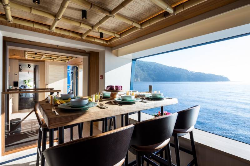 From flame-seared teppanyaki to fresh sashimi on the sundeck, every meal on board has a sense of theatre. Inside, the formal dining area is elegant yet unstuffy, while outdoors, dinners stretch late into the evening under the stars.