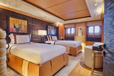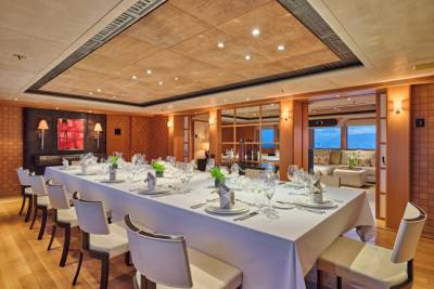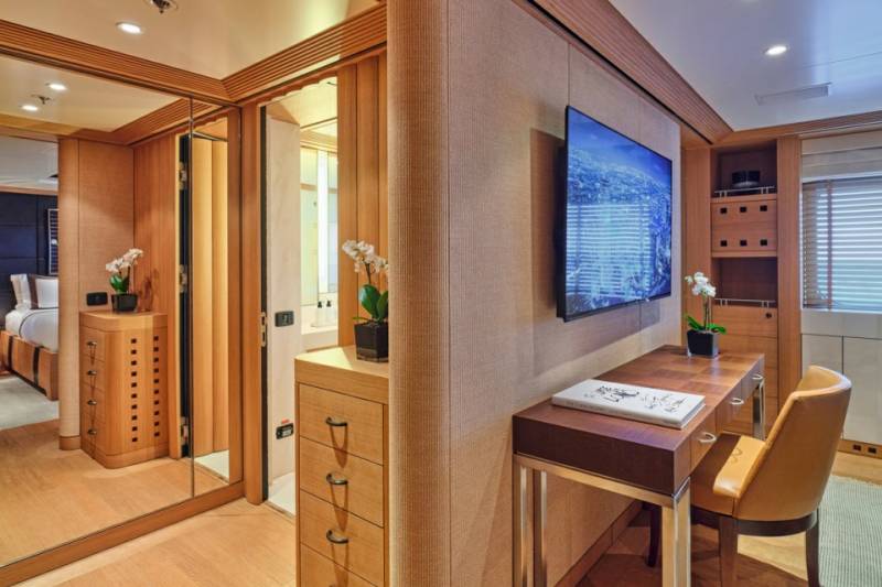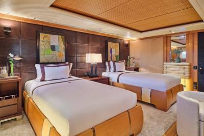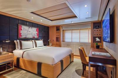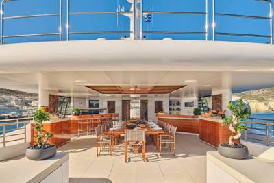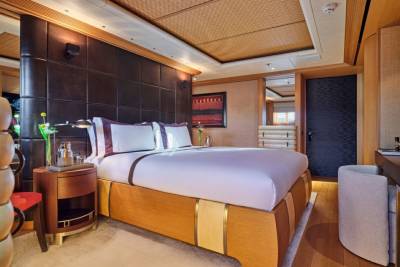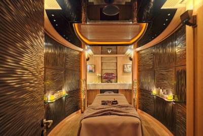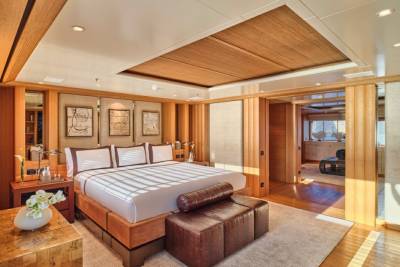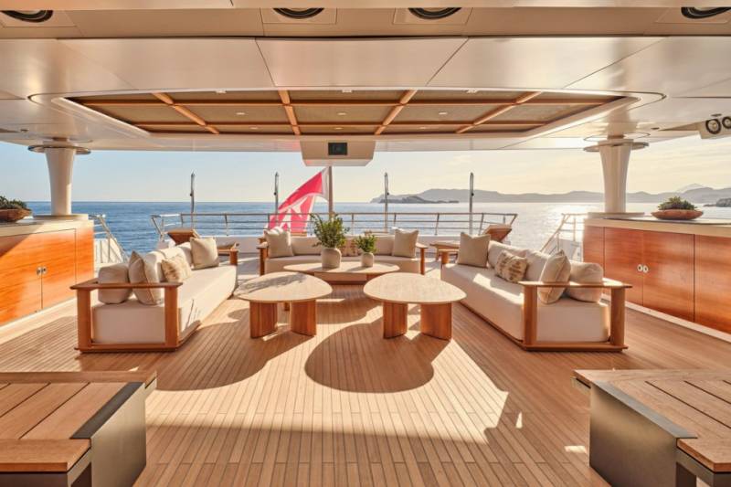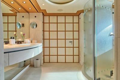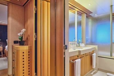 Terence Disdale’s interiors are clean-lined and quietly confident — layered textures, neutral tones, a Zen influence. It’s a calming counterpoint to the yacht’s size and presence. You can switch off. Or turn it up. You choose.