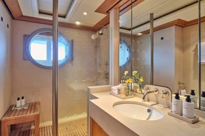 The full-beam master is a lesson in opulence — king bed, lounge space, oversized windows, and total privacy. You’re front and centre, just as it should be. With seven cabins — including two VIPs on the main deck and two twins below — Kogo works for big families, charter groups, or just those who like options.