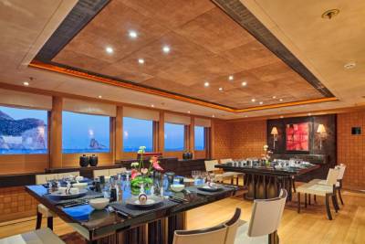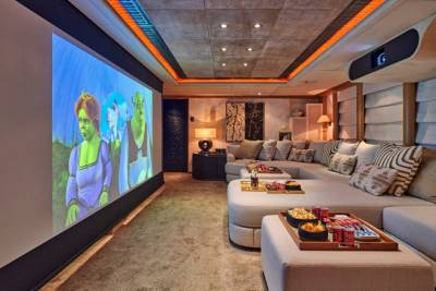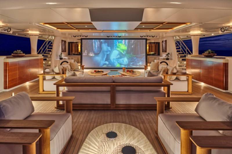 The bridge deck transforms into an outdoor cinema with views for days. Prefer air-con and popcorn? The main lounge has a full setup too. This is private screening, charter style.