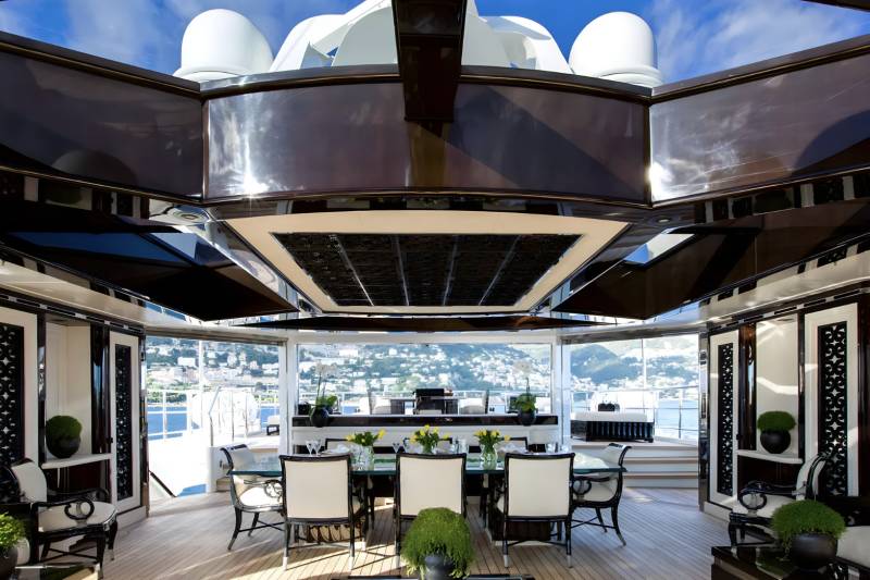The bridge aft deck on Lioness V features a spacious al fresco dining area, which comfortably accommodates up to 14 guests. This generously sized outdoor space is perfect for hosting elegant meals and gatherings, offering a scenic backdrop and fresh sea air.